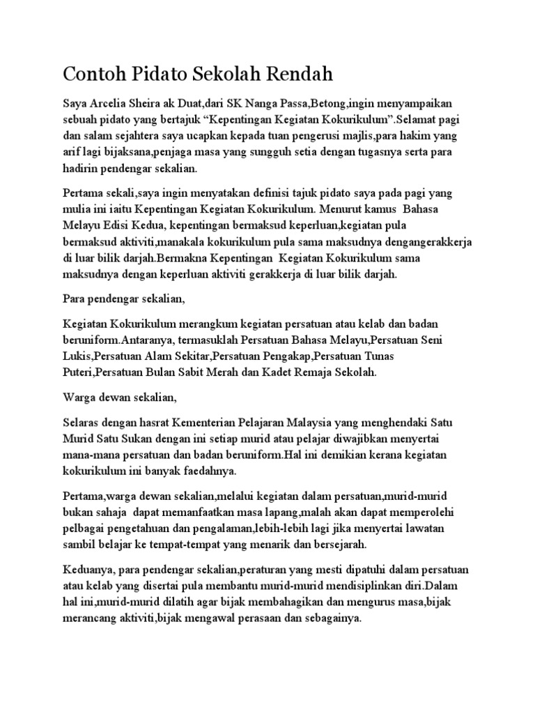 Terima kasih pengacara majlis. Saya arcelia sheira ak duatdari sk nanga passabetongingin menyampaikan sebuah pidato yang bertajuk kepentingan kegiatan. Teks Pidato Bahasa Melayu Sekolah Rendah.